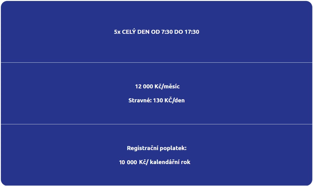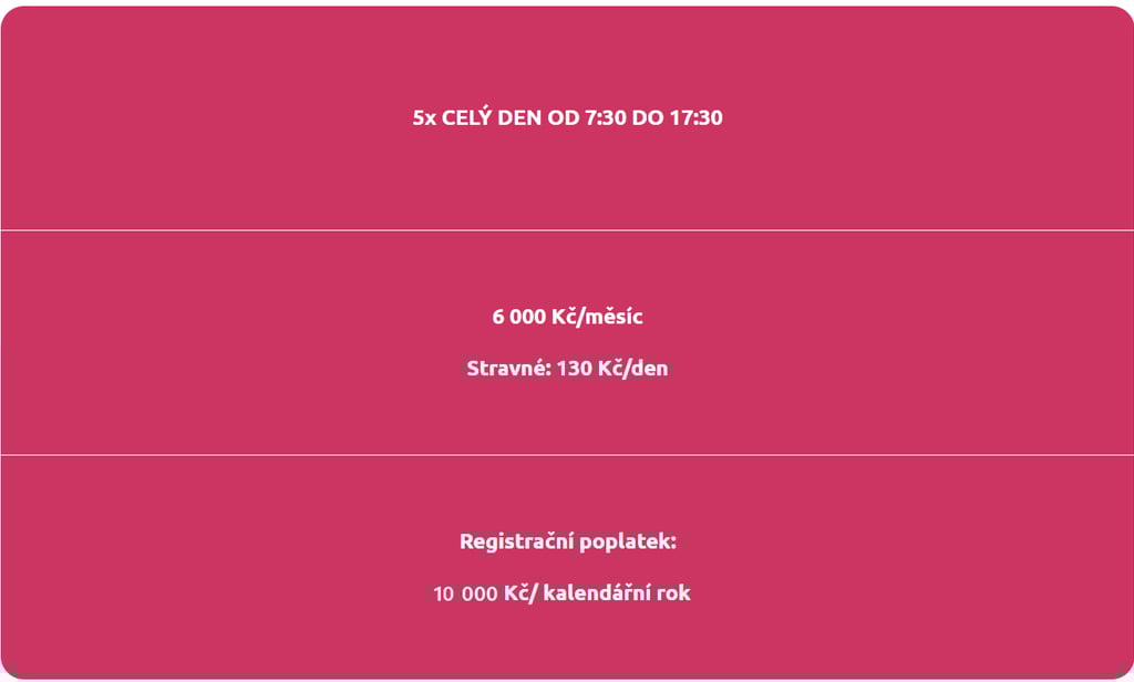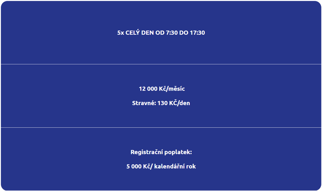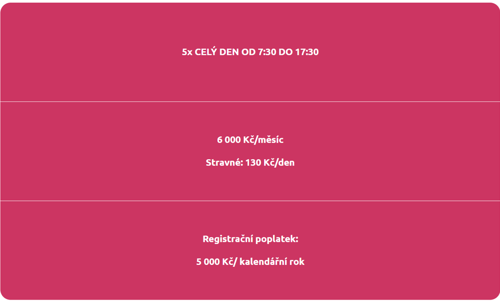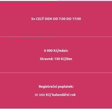 celodenní docházka: 130 Kč (svačina, oběd, svačina, pitný režim)
