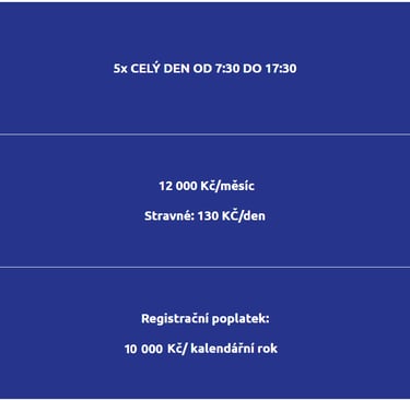 Speciální programy jako je divadlo, exkurze, různé vzdělávací programy, výlety, lekce plavání atd. jsou hrazeny zvlášť.