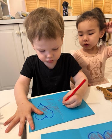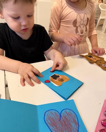 Our toddlers enjoyed creating simple Valentine’s Day cards. They explored colors and materials while practicing fine motor skills and expressing kindness. We are proud of their participation and enthusiasm.